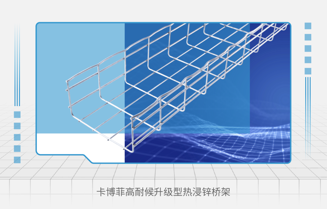 一段理想的桥架,除具备高质量的承载力之外,还要材质过硬,防锈蚀性佳,同时表面光滑平整,才能更佳实现对线缆的长期保护。卡博菲新品高耐候升级型热浸锌桥架,以防锈蚀力强、崭新外观和高承载力三大优势使产品性能翻倍。