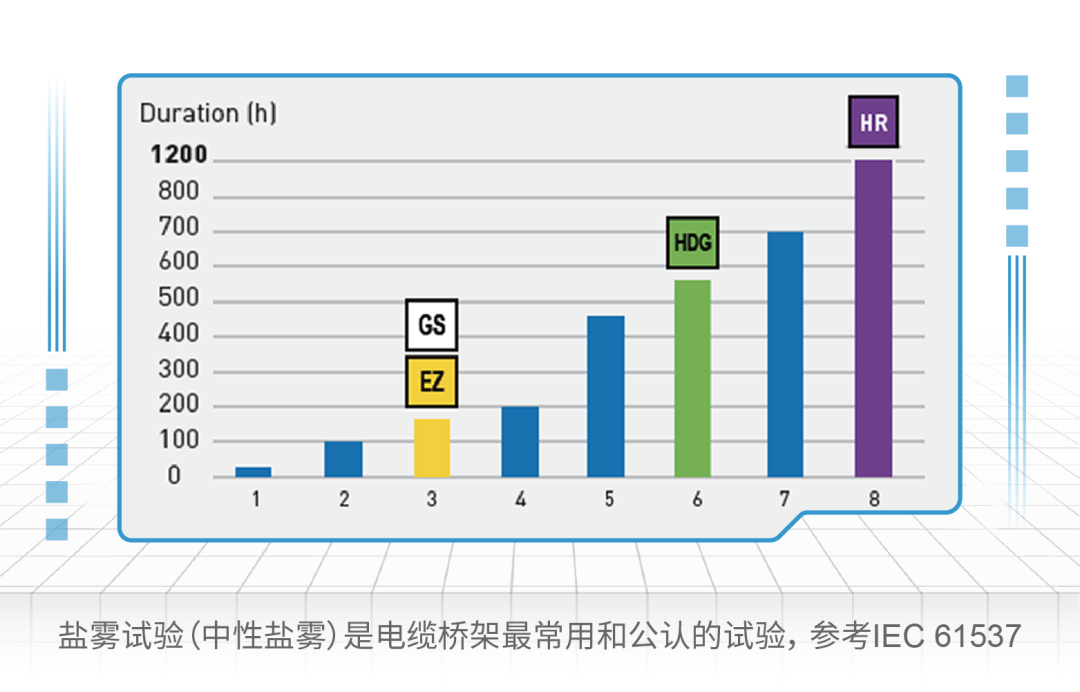 卡博菲突破现状,将原本防锈蚀性能处在第6等级①的热浸锌(HDG)桥架进行产品升级,使桥架在中性盐雾试验550H无红锈产生的时间提高至1200H②第8等级,防锈蚀性能提升一倍以上,升级后的高耐候(HR)热浸锌桥架大大延长了产品使用寿命。
