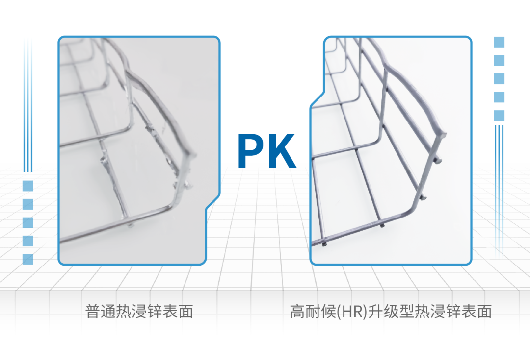 卡博菲持续关注并致力于解决这一问题,新品高耐候(HR)升级型热浸锌桥架,采用从国外引进的全新热浸锌配方及处理工艺,打造出光洁度高、表面顺滑的桥架产品,不易刮伤线缆,施工过程更安心。同时,洁净的桥架表面有效减少了积灰积尘,后期维护更省心。